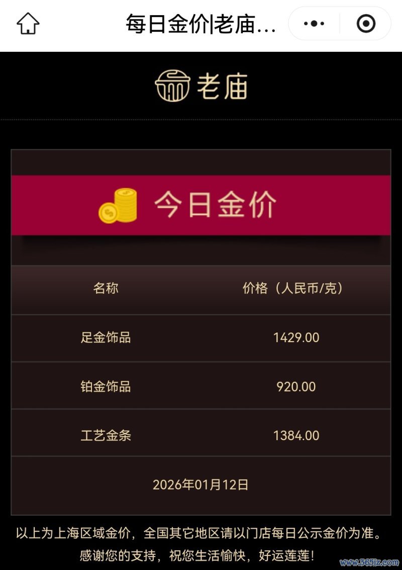 周生生金饰价格1429元/克,较前一日1410元/克的价格上涨19元/克;老庙黄金足金饰品标价1429元/克,较前一日1407元/克的价格上涨22元/克。周大福、老凤祥等品牌也都上调了金饰价格。